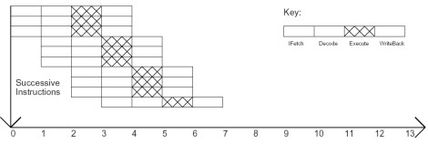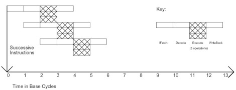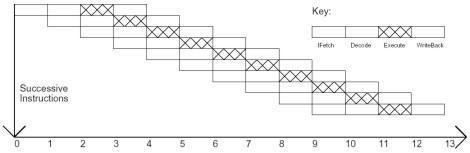 Questo tipo di architettura è nota come superscalare . Come si vede, prendendo sempre il numero 3 come moltiplicatore, l’utilizzo di 3 pipeline in parallelo, dal punto di vista del numero di cicli necessari a portare a compimento 10 istruzioni è equivalente al caso di architettura superpipelined con 3 segmenti per ogni stadio. Questo nel caso ideale.