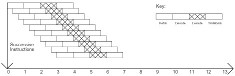 Come si vede, ipotizzando un comportamento ideale una ipotetica pipeline a 4 stadi (sto semplificando al massimo le cose) impiega 13 cicli per portare a compimento l’esecuzione di 10 istruzioni elementari.