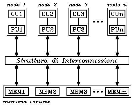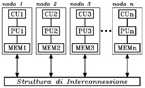 L’altro modello, quello a memoria distribuita, si presta meglio ad esere implementato all’interno dei processori. Lo schema è quello in figura