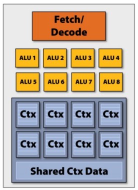 in cui si vede che c’è un unico stadio di instruction fecth e decode con un unico icache (instruction cache) che pilota un gruppo di alu dotata, ciascuna, di una sua memoria locale.