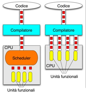 Daun lato, abbiamo quindi un’architettura che permette una più elevata densità di unità funzionali, dall’altra un’architettura le cui prestazioni sono meno dipendenti dall’ottimizzazione del codice. Ma le differenze non si fermano qui. In un’architettura superscalare l’ILP è gestita at run time da un hardware scheduler mentre in un’architettura vliw è gestita at compile time .
