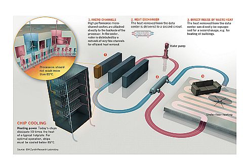 Lo studio portato avanti dagli scienziati di IBM in collaborazione con ETH ha dimostrato che adottando un tale sistema diraffreddamento a liquido diretto, sfruttando la tecnologia definita “micro-channel”, si riesce a ridurre il consumo di un blade server del 40%. Inoltre, il progetto prevede anche il recupero del calore dissipato, incanalando l’acqua che è stata utilizzate per raffreddare i server verso uno scambiatore di calore centralizzato cui è collegato un sistema di riscaldamento a pavimento degli alloggi universitari.