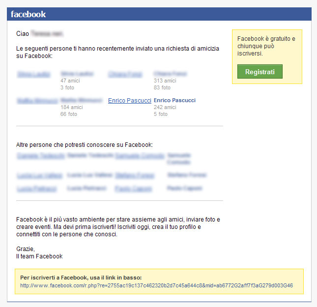 Mi rendo conto che per qualcuno ormai può risultare incredibile, ma esistono persone che ancora non hanno un account Facebook. Proprio una di queste mi ha inoltrato una mail originariamente inviatale proprio dal social network in questione, per invogliarla ad iscriversi e ne ho fatto uno screenshot per mostrarvelo.