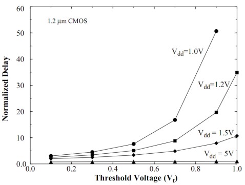 da cui si vede che al diminuire di Vdd e all’avvicinarsi del suo valore a quello della tensione di soglia dei due transistor, se da un lato cala il numeratore, dall’altro diminuisce molto più velocemente il denominatore, facendo dilatare il tempo Td di ritardo nella commutazione. Una soluzione potrebbe essere qualla di utilizzare tensioni di soglia inferiori, ma si tratta di una soluzione che presenta due inconvenienti: un aumento del rumore e, quindi, della affidabilità del circuito e, soprattutto, un aumento delle correnti di sottosoglia che provocano un aumento della dissipazione di potenza statica. Nella figura in basso, sono riportati gli andamenti di Td, al variare di Vth (tensione di soglia), per vari valori di Vdd