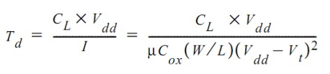 dove tp rappresenta il tempo necessario ad effettuare lo switch dei transistor (in particolare del pmos), mentre una prima grossolana analisi quantitativa si può fare tramite la seguente equazione che tiene conto solo di alcune delle variabili che influiscono sul ritardo nella commutazione al variare di Vdd