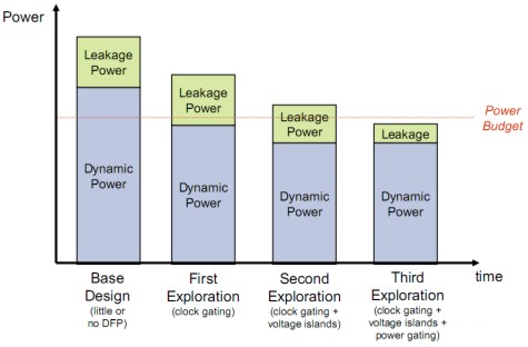 In questo modo è possibile impostare dinamicamente la tensione area per area o toglierla del tutto dove non serve, tramite power gatin su una o più aree. In tal modo è possibile ridurre sia le componenti dinamiche che quelle statiche della potenza dissipata e rientrare nel “budget di potenza” prefissato, come mostrato nella seguente figura