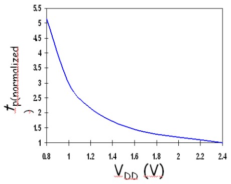 Veniamo, ora, al problema connesso alla riduzione di Vdd; come detto, quando il suo valore inizia a diventare comparabile con quello delle tensioni di soglia dei transistor il circuito inizia a “girare a regimi più bassi”, come un motore al quale si toglie potenza. Un andamento qualitativo del fenomeno è riportato in figura