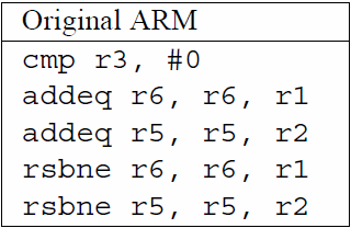 A seconda del contenuto di R3 ci sono due possibilità. Se risulta zero vengono eseguite le due ADDEQ, mentre le RSBNE sono eseguite, ma non producono alcun effetto (sono esattamente come fossero delle NOP). Viceversa, se R3 è diverso da zero, le ADDEQ non producono effetti, mentre le RSBNE sì. A prescindere dal caso, la CPU impiega sempre 5 cicli di clock, perché tutte le istruzioni vengono comunque eseguite.