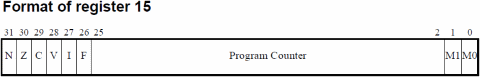In realtà non esiste un vero e proprio registro di stato, poiché tutti e 6 i bit sono stati impacchettati nei 6 bit alti del registro R15, che è… il Program Counter. Del quale si sfruttano anche i due bit bassi, che normalmente sarebbero sempre posti a zero poiché gli opcode sono sempre a 32 bit, e l’indirizzo di memoria è sempre allineato a questa quantità.