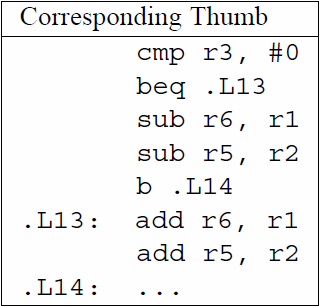 Riporto adesso l’equivalente per un microprocessore “tradizionale”, che non abbia alcuna forma di esecuzione condizionale o predicativa. Nello specifico, si tratta di codice Thumb (che è una particolare ISA e modalità di esecuzione introdotta negli ARM a partire dall’ARM7, e di cui forse parlerò in futuro), che non possiede il meccanismo di cui ho parlato finora: