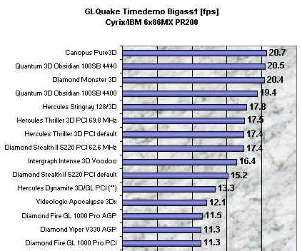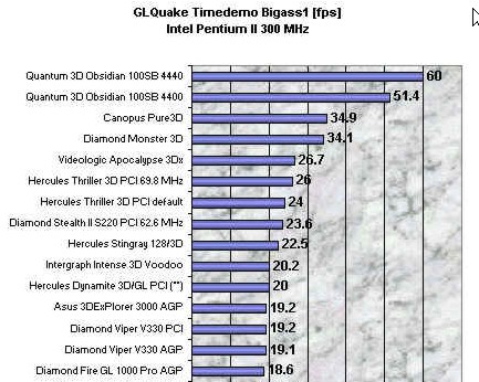 Come si vede, dova la cpu fa, il più delle volte, da collo di bottiglia, i chip Rendition (Hercules Thriller e Diamond Stealth) risescono a distanziare i Riva 128 e ad avvicinare le prestazioni degli acceleratori equipaggiati con i chip Voodoo, addirittura ion configurazione multichip, come nel caso delle quantum 3D obsidian, di cui, per curiosità, riporto l’immagine nella versione 4400 con 2 Bruce e 2 Chuck e 12+2 MB di ram on board.
