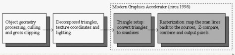 Qui sono riportati, in maniera molto semplificata, gli stadi in cui è suddivisa l’elaborazione di un’immagine 3D. La figura è riferita alla situazione nel corso del 1998, in cui molti dei chip erano già dotati di triangle setup engine. I due blocchi in bianco sono quelli relativi alle operazioni di trasformazione e illuminazione che, nel 1998, erano ancora interamente a carico della cpu; i due in grigio, invece, sono relativi alle operazioni di conversione dei triangoli in scan line e delle operazioni rasterizzazione compiute sulle scan line.