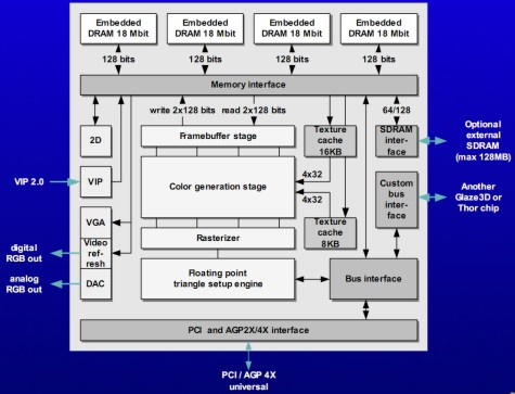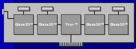 dove l’unità indicata col nome Thor è un’unità geometrica di tipo T&L. Inutile dire che facendo un paragone con il Voodoo 5, composto da 2VSA-100 (il chip della Voodoo4), se un Glaze3D è più veloce di una Voodoo4, c’è da immaginarsi cosa riuscirebbe a fare un simile mostro, con 4 Glaze3D e un’unità di T&L.