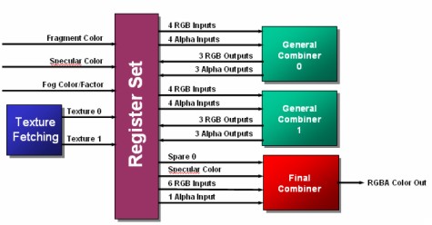 Il Flipper è un chip dotato di 4 pipeline di rendering, ciascuna provvista di 1 TMU con Texture EnVironment engine (TEV) dal funzionamento analogo ai texture register combiner del Geforce 256; la funzione di questi combiner è quella di prelevare i dati in ingresso (RGA e alpha, dati sulle texture) e combinarli tra loro, eseguendo operazioni di addizione e moltiplicazione. In particolare NV10 era dotato di 3 combiner in cascata, i primi due soltanto, dei quali, utilizzati dalle DX7, mentre il terzo riservato alle OpenGL (v. figura sottostante)