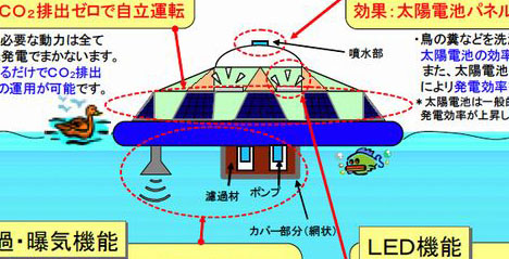 Ormai battezzati dai media giapponesi con il nome UFO, questi depuratori flottanti pensano più di 3 tonnellate e misurano 5 metri di diametro e 1.6 metri di altezza. Dispositivi di grandi dimensioni quindi, in grado di depurare la bellezza di più di 9000 litri d’acqua in 6 ore di operatività. Inoltre, a sottolinearne il basso impatto ambientale, funzionano unicamente ad energia solare fornita da pannelli montati sulla superficie esterna.