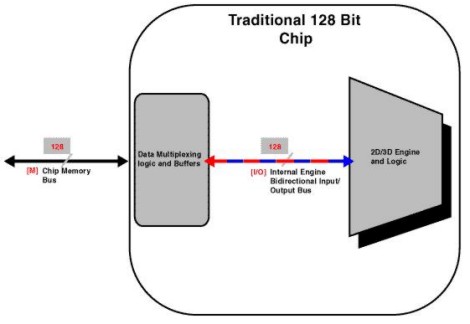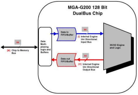 La G200 presentava alcune soluzioni interessanti a partire dal, cosiddetto, dual bus . Per capire di che si tratta, niente di meglio di qualche immagine. In basso un’architettura a 128, del tipo, per intenderci, di quelle di chip come il Riva 128 o il Riva TnT