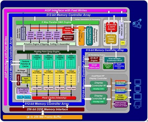 In basso, lo schema architetturale della matrox Parhelia