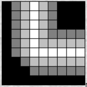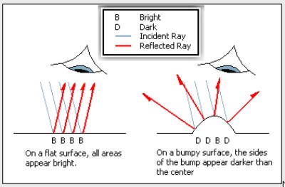Come si può vedere, man mano che ci si allontana dalla linea ideale che congiunge il punto di osservazione a quello in cui si calcola il valore di illuminazione, si passa a valori sempre più scuri. Il gioco di chiaro-scuri fa si che il cervello crei l’illusione di maggior realismo, attraverso la rugosità della superficie, come si vede in basso