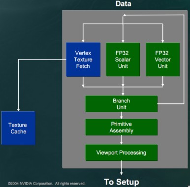 Se il bump mapping trae giovamento delle capacità di multitexturing delle tmu, il displacement mapping richiede la capacità delle unità geometriche di fare un’operazione di texture fetching, esattamente come accade con le unità di pixel shader. Le unità di vertex shader devono essere in grado di “prelevare” texture non filtrate da utilizzare come base per le operazioni di “spostamento” dei vertici. La feature, prevista dallo Shader Model 3.0 delle DX9 può avere differenti modi di implementazione. Nell’immagine in basso una unità di vertex shading dell’NV40, in cui si vede il circuito dedicato al vertex texturing che ha accesso diretto alla texture cache.