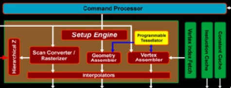 Con l’avvento dei chip a shader unificati torna anche l’unità fisica di tessellation, questa volta in forma completamente programmabile. La tessellation, però, non fa parte degli standard directX, pertanto è solo ATi ad implementarla nei suoi chip. Finalmente, con le DX11, la tessellation diventa standard anche se la sua implementazione differisce da quella proposta da ATi ocn la serie 4xx0 e, sembrerebbe, anche da quella proposta da nVidia con GT300. Analizzando brevemente le architetture dei tessellator di RV770 ed RV870 si nota subito, nel secondo, la presenza di due nuovi stadi, hull shader e domain shader, assenti nel chip DX10.1.