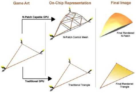 Il primo esempio di tessellator su chip di tipo consumer è stato quello presente su R200, che faceva uso di n-patches e passò alla storia col nome commerciale di Truform. Nonostante le limitazioni e lo scarso supporto, riuscì a fornire, in alcuni titoli, tangibili miglioramenti a livello di grafica. In basso, uno schema che indica il funzionamento di massima del truform di R200