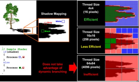 Un altro vantaggio di R520 in particolare ma anche di R580 rispetto alla controparte verde è nella gestione del dynamic branching: i chip ATi fanno, infatti, uso di una granularità dei thread molto più fine: 16 pixel e 64 (come Xenos) rispettivamente per la X1800 e la X1900 contro, ad esempio, i 1024 di NV40 e i circa 800 di G70. In effetti il dynamic branching dei chip nVidia, fino a G80 escluso, non è affatto gestito in maniera efficiente poichè l’uso di batch di pixel di grandi dimensioni rende più difficili le “previsioni” dei salti condizionali, come mostra la sottostante figura