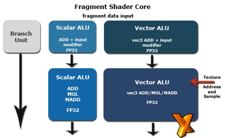 da cui si vede che ognuna delle 48 alu è, di fatto, composta da una ADD vect3 + fp32 scalar seguita da una MADD vect3 + fp32 scalar. Contrariamente a quanto visto nei chip nVidia, l’unità di branching in parallelo con le alu e non in serie. Ogni alu così composta è in grado di eseguire un massimo di 4 istruzioni (2 ADD co-issue più 2 MADD co-issue) oltre ad un accesso a texture ed una istruzione di branching in parallelo.