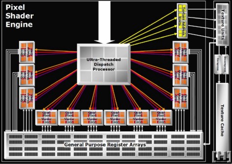 La scelta di mettere le tmu fuori dallo shader core e la mancanza di testure unit nelle unità di vertex shading è un chiaro segno di quanto questo chip sia stato ideato, in realtà, pensando al suo successore; infatti nei chip a shader unificati non ha senso pensare ad una divisione tra unità di vertex e pixel shading ed una tmu che fa texture fetch può mettere la texture a disposizione sia delle operazioni di vertex che di pixel shading, indifferentemente. Come vedremo, anche in R600 le tmu sono fuori dallo shader core.