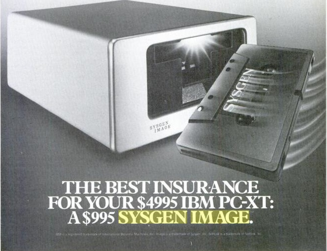 In questo contesto s’inserisce l’offerta di un’azienda californiana, la Sysgen, il cui motto è “Un hard disk senza nastro non ha senso”. L’offerta di sistemi di backup Sysgen nel 1983 fa perno sul modello Image, un’unità che sfrutta normali audiocassette per backup fino alla ragguardevolissima capacità di 10MB: a titolo di confronto, basti ricordare che l’unità floppy per eccellenza del Commodore 64, il 1541, utilizzava dischetti da 5 e 1/4 con una capacità di 170KB; le audiocassette per 64, di dimensione variabile a seconda del nastro, contenevano anch’esse poche decine di KB.