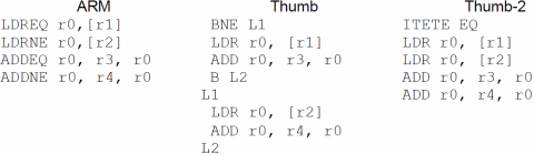 Quello Thumb-2 è il più oscuro, ma si spiega facilmente prendendo l’istruzione utilizzata, ITETE, e considerando che T = Then ed E = Else. Quindi le seguenti 4 (TETE) istruzioni vengono eseguite sulla base della condizione EQ (di equivalenza o uguaglianza a zero) per la prima (che è sempre T) e la terza, mentre di quella opposta (NE, non equivalenza o diverso da zero) per la seconda e la quarta.