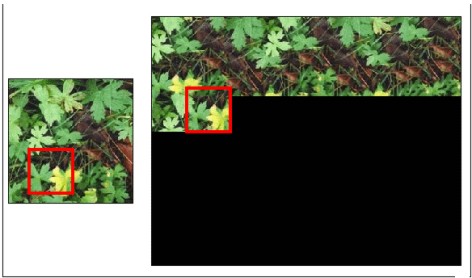 Nell’immagine, il riquadro rosso della texture base (sulla sinistra) si muove in maniera del tutto casuale e, ai suoi spostamenti, corrispondono i movimenti del riquadro della texture finale (sulla destra) che invece, riempie la superficie partendo dal riquadro in alto a sinistra e procedendo in maniera ordinata da sinistra a destra e dall’alto in basso (come il pennello di un cinescopio CRT).