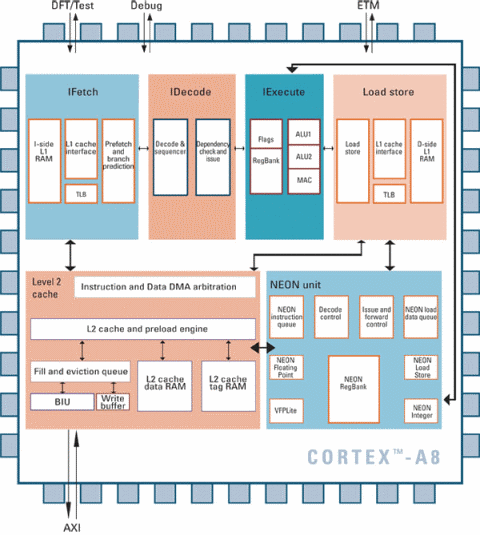 - NEON, un’unità SIMD dedicata al calcolo di operazioni su vettori di 64 o 128 bit (su registri dedicati) contenenti valori interi (16 o 32 bit) o in virgola mobile (a precisione singola, 32 bit), che opera in maniera indipendente dalla pipeline principale (dalla quale comunque attinge le istruzioni da eseguire)