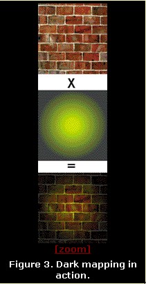 Abbandoniamo la storia del multitexturing per vedere alcune delle sua applicazioni: uno dei primi effetti creati riguardava l’illuminazione; prendendo una mappa di base e una dark map con effetti di illuminazione e applicandole una sull’altra, si potevano ottenere effetti come quello in figura
