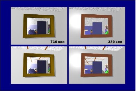 A sinistra le immagini elaborate in raytracing e a destra quelle con EMBM. Al di là del fatto che, a giudicare dagli fps, il sistema adoperato non pare di ultima generazione, si vede come, nel confronto tra le due immagini in alto, quella con EMBM restituisca, tutto sommato, un risultato apprezzabile. In quelle in basso si nota, invece, come in quella con EMBM risulti un mancato allineamento tra le linee parallele riflesse e quelle sul soffitto; allineamento presente, invece, nell’immagine con raytracing.