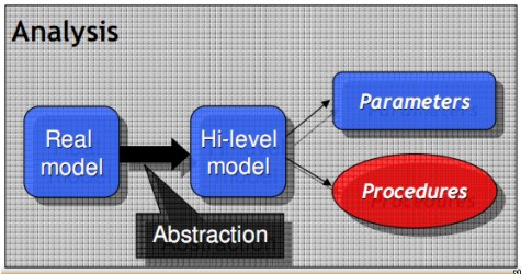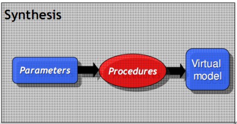 dalla prima immagine si vede come, partendo dall’analisi di un modello reale, si arrivino a definirne le caratteristiche attraverso un processo di astrazione. Da qui, il passo successivo è quello di ricavare i parametri che caratterizzano il modello ottenuto e gli algoritmi in grado di permettere di replicare quello stesso modello (variando, ovviamente, i valori dei parametri per ottenere effetti differenti).