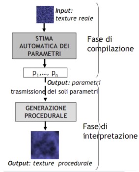 Alla base delle texture procedurali c’è la creazione di un modello virtuale che parta da un suo corrispettivo reale e, attraveros una serie di passaggi intermedi che prevedono l’analisi di un modello reale e portano alla codifica di algoritmi o procedure che ne definiscono le caratteristiche in modo che le stesse siano riporducibili nel modello sintetizzato, liberando il programmatore dalla necessità di definire specifiche dettagliate dello stesso. I vari passi sono riportati nelle due figure in basso