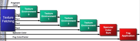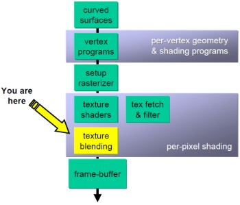 dove, in giallo, è indicato lo stadio relativo ai texture combiner, mentre le TMU sono indicate, immediatamente sopra di esso, come “texture shader” e “texture fetch and filter”.