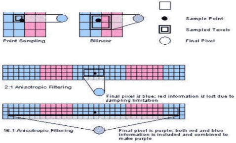 Nel corso degli anni e con l’aumento della potenza di calcolo dei chip, le tecniche di filtraggio hanno subito delle variazioni e, in particolare, il filtraggio delle texture è passato dal semplice point sampling fino all’AF (anisotropic filtering) visto sulle GPU ATi di ultima generazione, che “non dipende dalla direzione di applicazione”.