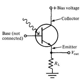 Come si vede dallo schema, il principio di funzionamento è quello di un transistor a giunzione, in cui la corrente elettrica di base che modula quella che scorre tra collettore ed emettitore è determinata dalla radiazione luminosa incidente sulla stessa base. Rispetto al fotodiodo, il fototransistor ha una corrente di uscita pari alla somma di Ib (corrente di base), equivalente alla corrente generata nel fotodiodo dalla luce incidente, sommata alla dark current e moltiplicata per il guadagno del transistor.
