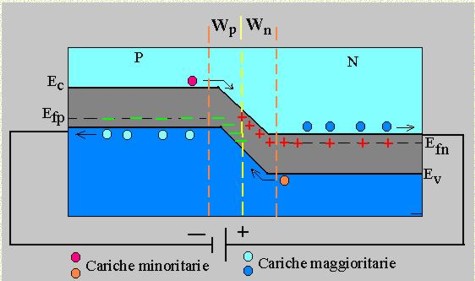 In questa situazione abbiamo un campo elettrico nella zona di svuotamento, dovuto alle cariche minoritarie (lacune nella parte n ed elettroni in quella p) ed uno esterno. Nella zona di svuotamento, le lacune presenti sulla destra (lato n) tendono ad attirare gli elettroni del lato n che, però, sono respinti dagli elettroni presenti nella parte sinistra della zona di svuotamento.