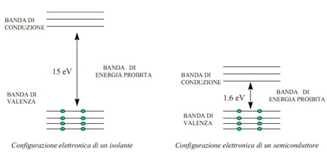 Si può dire che, tornando alla figura che riporta lo schema a bande, in un conduttore il fondo delle banda di conduzione e il limite superiore di quella di valenza finiscono quasi con il sovrapporsi, facilitando il trasferimento degli elettroni dalla seconda alla prima. La differenza tra un semiconduttore ed un isolante, invece, è nella misura del gap tra le due bande che nell’isolante è molto maggiore, rendendo, di fatto, impossibile il trasferimento degli elettroni nella banda di conduzione (gli elettroni sono fortemente legati ai propri nuclei).