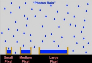 Ad ogni “refresh” si contano quanti elettroni sono stati collezionati da ciascun fotosito e questo conteggi dà la misura dell’intensità luminosa ricevuta. In teoria, al nero dovrebbe corrispondere un contenitore vuoto, mentre al bianco uno completamente pieno. Ovviamente non tutti i contenitori sono di uguali dimensioni e, di conseguenza, non tutti sono in grado di raccogliere la stessa quantità di acqua……pardon, di fotoni.Questa capacità è detta full well capacity. I pixel di dimensioni maggiori avranno una full well capacity superiore rispetto a quelli di dimensioni inferiori.
