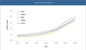 Per i motivi sopra elencati, ovvero per la presenza di due fotodiodi per la banda del giallo-verde,, nei grafici che mostrano il rumore prodotto da un sensore digitale si nota come la componente relativa al verde sia sempre quella che presenta il miglior SNR e, d’altra parte, a parità di condizioni con le altre sarebbe anche quella il cui rumore sarebbe percepito con maggior evidenza. A riprova di ciò, mostro l’endamento del rumore per le varie ocmponenti di colore (oltre che per la luminanza) per la nuova EOS 7D
