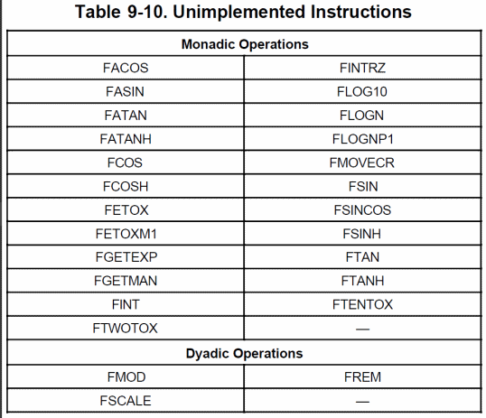 Purtroppo, come per le MMU, sono stati apportati dei “tagli” a quest’unità, che non permette di utilizzare il formato packed BCD e supporta soltanto un ristretto insieme di operazioni (soltanto quelle più comuni):