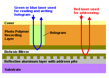 Come si vede in figura, un HDV legge/registra i dati da/su una lamina olografica posta verso la superficie del disco usando un laser nel verde (intorno ai 500 nm di lunghezza d’onda). La memorizzazione olografica consiste nell’immagazzinare dati in un cristallo non solo planarmente ma sfruttando anche la terza dimensione: questo consente di migliorare sensibilmente la densità di memoria disponibile a parità di volume rispetto a tecnologie planari, come il classico DVD. La posizione all’interno del disco è invece letta da un fascio nel rosso (sopra i 700 nm) da un sottile strato di alluminio posto sul fondo del supporto. Per evitare che la luce verde penetri fino all’alluminio, al di sotto del materiale olografico è posto uno specchio dicroico (molto selettivo in frequenze) che lascia passare soltanto il laser preposto alla lettura delle informazioni di posizione.