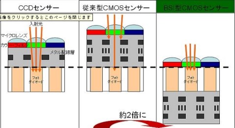Il problema della minor superficie utile alla cattura dei fotoni è stato risolto con la diminuzione delle dimensioni degli elementi circuitali e con l’adozione di lenti sempre più sofisticate e in grado di catturare la stragrande maggioranza della radiazione incidente per dirottarla sui fotositi; la situazione migliora ulteriormente con l’adozione della tecnologia BSI (back side illuminated) che si oppone alla molto più diffusa FSI (front side illuminated) in quanto posiziona i circuiti elettronici nella parte inferiore del sensore anzichè in quella superiore, come illustrato in figura dove, a termine di confronto, è presente anche un CCD
