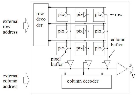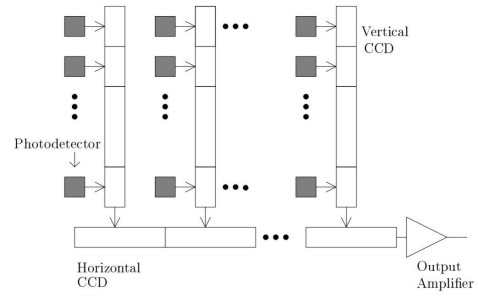 A questo punto, occorre iniziare a fare un primo distinguo tra le diverse tecnologie alla base dei sensori digitali. Per cui mettiamo da parte temporaneamente l’analisi delle componenti del rumore limitandoci a prendere in considerazione, di volta in volta, solo quella attinente alla specifica trattazione del momento. Come abbiamo visto, il punto di partenza comune a tutti è la presenza di una superficie formata da celle in grado di catturare la luce incidente. Già da qui, però, occorre fare un primo distinguo tra CCD e CMOS. Nelle due figure successive sono riportati, rispettivamente, un esempio di un sensore a CCD e di uno a CMOS di tipo APS (active pixel sensor, per distinguerlo dai CMOS di tipo passivo).