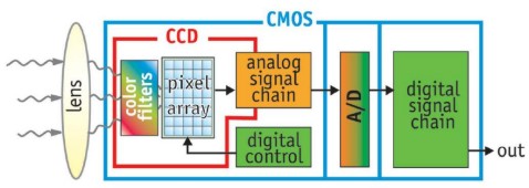 l’immagine riporta il confronto tra un sensore CCD e uno di tipo APS. Come si vede, nel CCD l’output del sensore è dato da una carica elettrica, ovvero un segnale di tipo analogico che deve essere elaborato a valle del sensore stesso. In un CMOS, invece, tutti i circuiti deputati all’elaborazione del segnale sono presenti sul sensore stesso; abbiamo visto che un primo stadio di amplificazione, di verifica della qualità del segnale e del valore del SNR è già presente a livello di singolo pixel. Inoltre, il prodotto finito, in uscita da un sensore CMOS è un segnale digitale e non una carica elettrica.