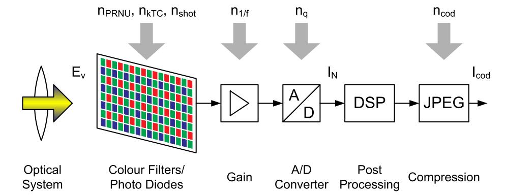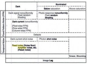 Già da questo primo schema, è evidente che le componenti di quello che viene comunemente definito rumore digitale sono molteplici e diverse tra loro. Oltre alle tre componenti connesse alle operazioni di acquisizione dell’immagine da parte della superficie fotosensibile, indicate, rispettivamente, con n(PNRU) (photoresponse non-uniformity), p(shot) che comprende il photon noise e il dark current noise ed n(KTc) o reset noise, si vedono anche il read noise (o amplifier noise) indicato con n(1/f), il rumore di quantizzazione recante la sigla n(q) e n(cod) ossia il rumore introdotto dalla codifica, ossia dalla compressione in formato non lossless. In seguito, andremo ad analizzare un po’ più da vicino queste componenti tra cui non figurano altri tipi di disturbo di cui si è già parlato in altre sedi, come ad esempio il moire.
