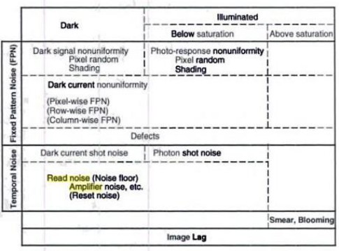 La presenza di elettronica sul sensore e, addirittura, in ciascun pixel, introduce, come si vede dalla precedente tabella, un rumore extra nei CMOS, a livello di singolo pixel. In precedenza avevamo visto come la corrente di buio sia originata dalla polarizzazione inversa di una giunzione p-n.Questa componente della corrente totale presente ha un moto contrario rispetto a quello della corrente generata dalle coppie elettrone-lacuna formatesi a causa della radiazione incidente e costituisce uno dei tipi di rumore sin qui elencati.